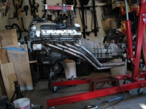 And here’s what i’ve got to work with. The mock-up engine is in the car without the tranny so it will be easier to finish making the exhaust. The tranny is huge..