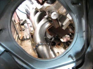 Here i am making sure the header will clear the steering column.. i had to re-do this side becaus my first attempt wasn’t good enough. YES i have to take the steering column out every time i need to pull the engine. and i need to pull the engine every time i need to take the headers off.. Yay for one-off custom stuff.