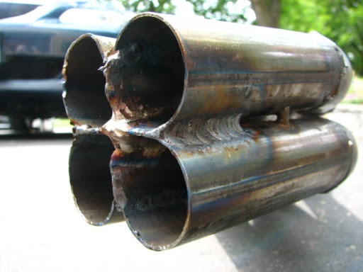 Here is the end of a header just before i put the collectors on. I had to pinch the tubes together all in the middle so there would be as little turbulence as possible. then you weld a + across each seam and a half an inch or so up each side. so when you put the collector on it seals off from the atmosphere. twas fun